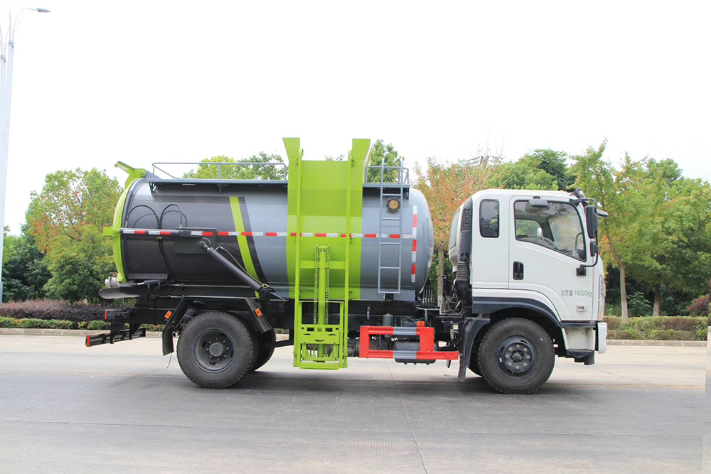罐体采用优质碳钢板材,罐体内部带固液分离功能(全推推板,不锈钢泔水分离网板),罐内加热功能(用于严寒地带防止罐内餐饮垃圾冻结凝固,采用柴油燃烧机加热,加热速度快效果好,可设置高低温实现自动温控)全液压操作系统,工作人员操作方便,罐体举升自卸,拉杆式挂桶提升机,可以挂120/240升垃圾桶进行作业,后盖液压驱动开启、锁紧,方便人员操作。