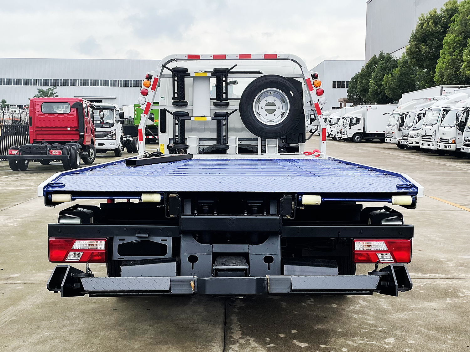 蓝牌上装配置:冲压式伸缩板,液压翻转常规托举装置,平板可承载4吨以内重物,主板长4~4.2米,折叠、伸缩或翻转部分1~1.35米,平板总长可达5.1~5.35米,双侧联动操作装置,后工作灯三只,1个40KN液压绞盘(25米钢丝绳)一个工具箱一个洗手箱,配两个**小车,四根新式绑带,链钩1条,L型抱胎架一对,托叉和托叉座各一对,带2吨后托臂。